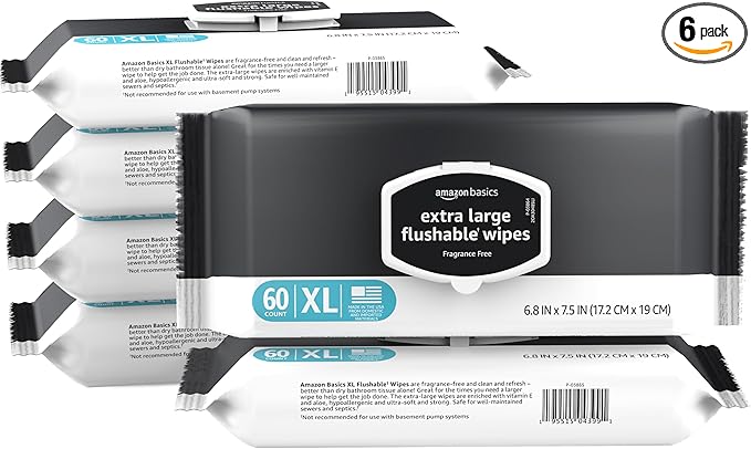 Amazon Basics Extra Large Flushable Wipes, 360 wipes (6 packs of 60), Adult Wet Wipes and Resealable closure